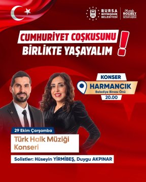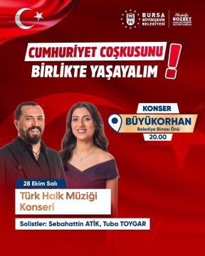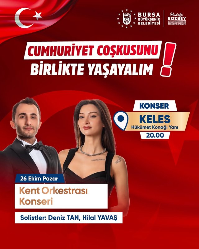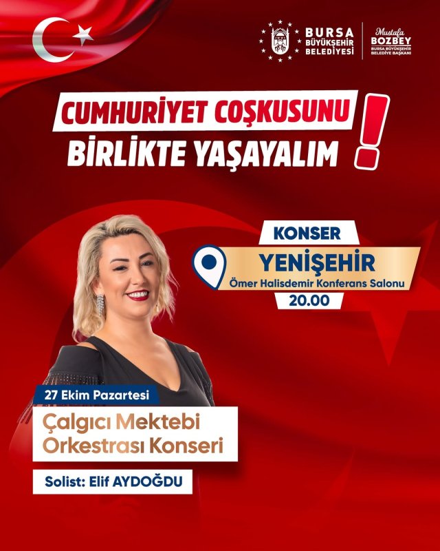 Cumhuriyet Bayramımızın coşkusunu bu yıl da kentimizin her köşesine yayıyor; Gürsu’da gerçekleştireceğimiz Kubat, Yıldırım’da gerçekleştireceğimiz Buray ve Orhangazi’de gerçekleştireceğimiz Işın Karaca konserlerimizin yanı sıra, Bursa Büyükşehir Belediye Orkestramızın değerli sanatçıları ile bu anlamlı günün heyecanını İznik, Keles, Yenişehir, Büyükorhan ve Harmancık ilçelerimize de taşıyoruz.