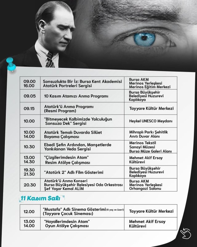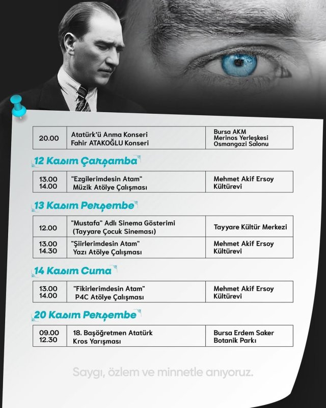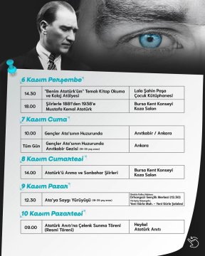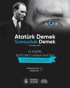 Cumhuriyetimizin kurucusu, Ulu Önderimiz Gazi Mustafa Kemal Atatürk’ü sonsuzluğa uğurlayışımızın 87. yılında, 6-20 Kasım tarihleri arasında gerçekleştireceğimiz anma etkinliklerimizde buluşalım.