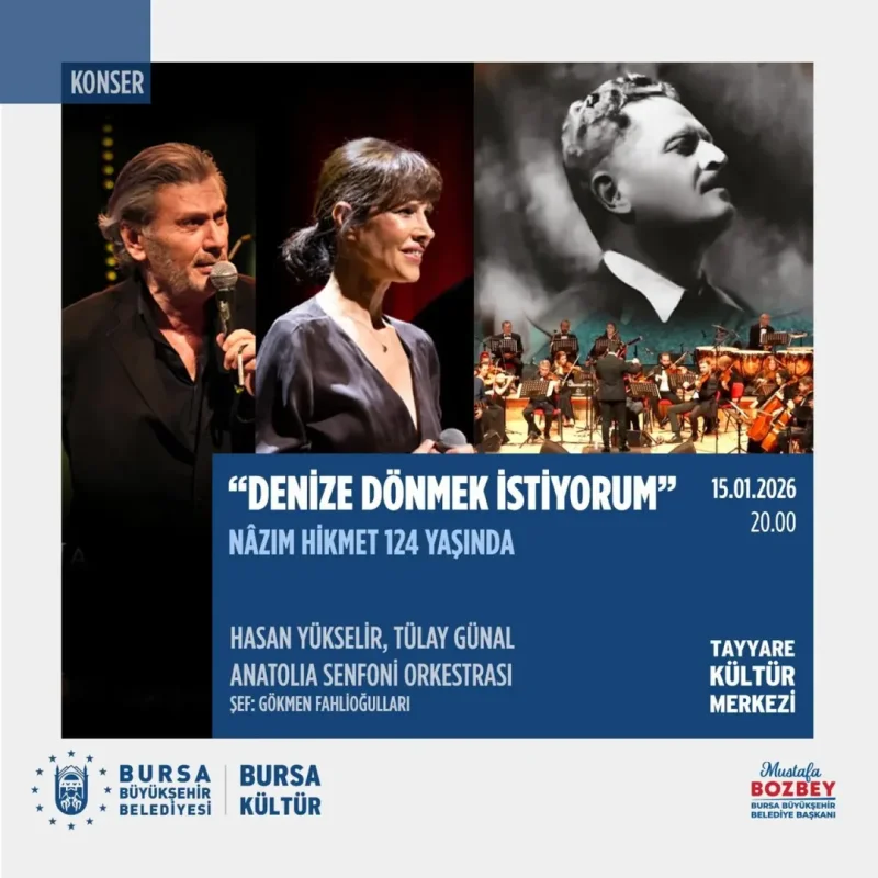 “Denize Dönmek İstiyorum” konserinde Hasan Yükselir ve Tülay Günal; Anatolia Senfoni Orkestrası eşliğinde, Gökmen Fahlioğulları’nın şefliğinde büyük ustanın şiirlerini müzikle yeniden yorumluyor. Şiir, müzik ve anlatının iç içe geçtiği bu konser, Nâzım Hikmet’in umudunu, direncini ve insan sevgisini sahnede yeniden hissettiriyor.