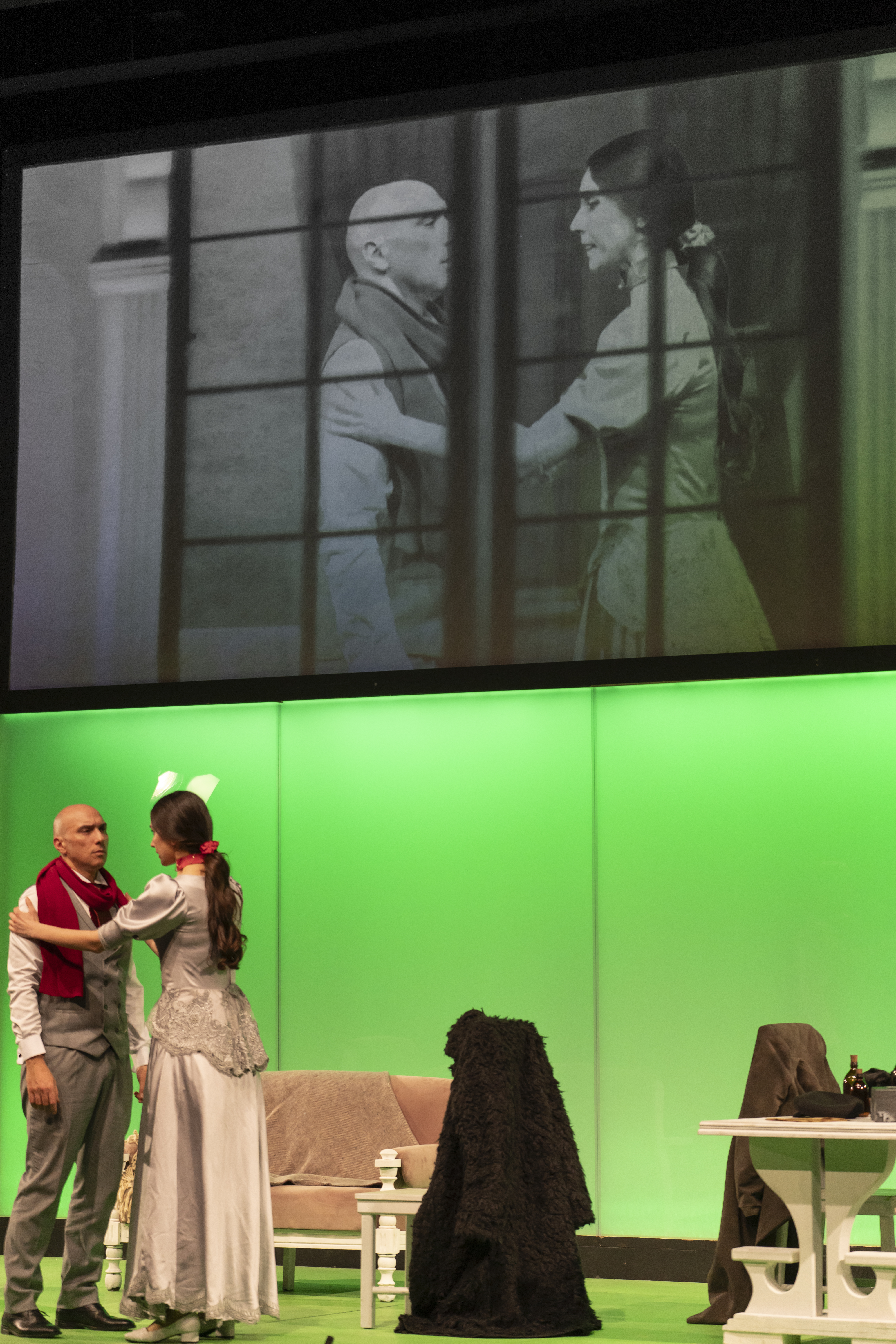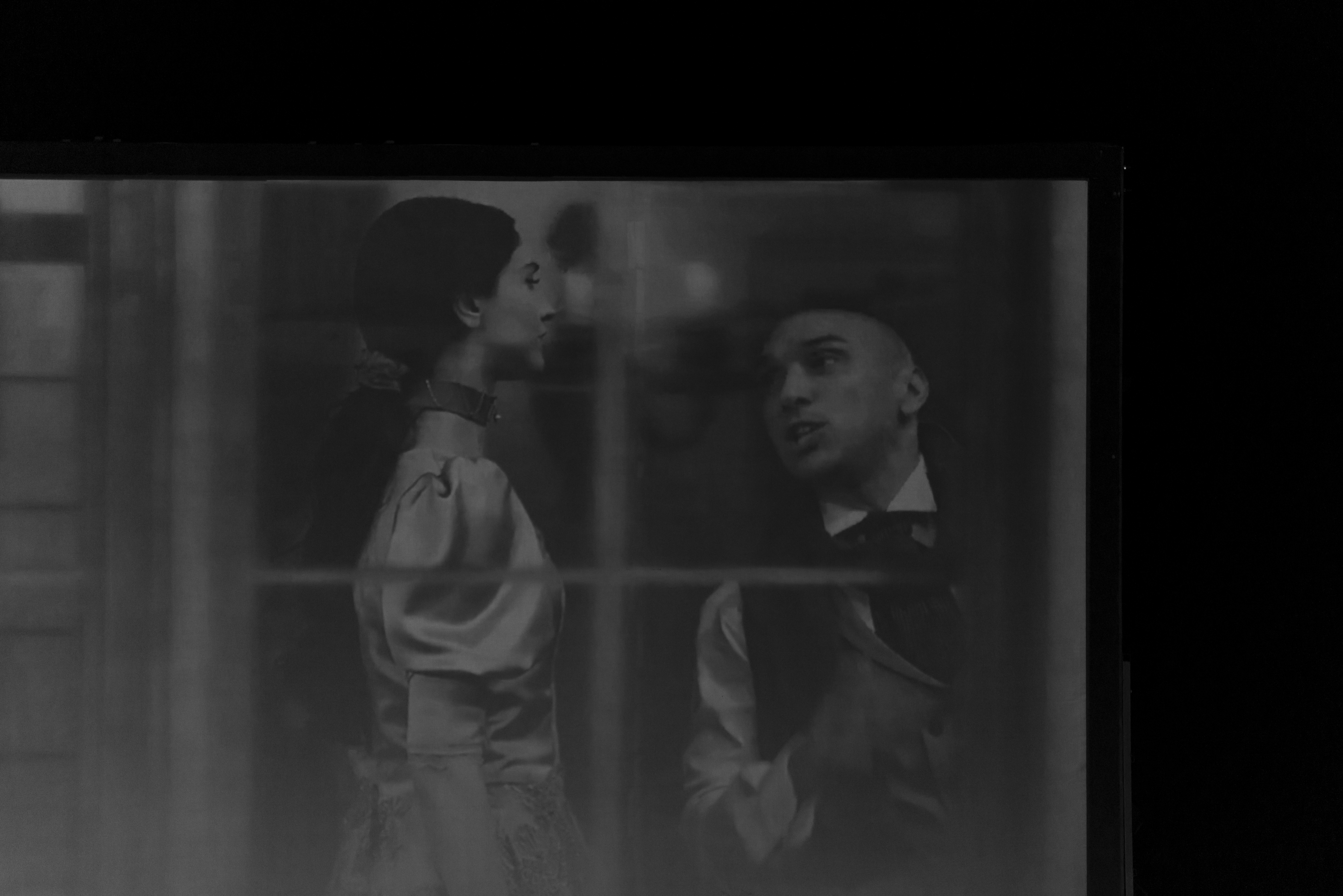 Oyuncular “şimdi ve burada” nefes alırken, arkadaki görüntü zamanı dondurur; yüzleri büyütür, bakışı çoğaltır.