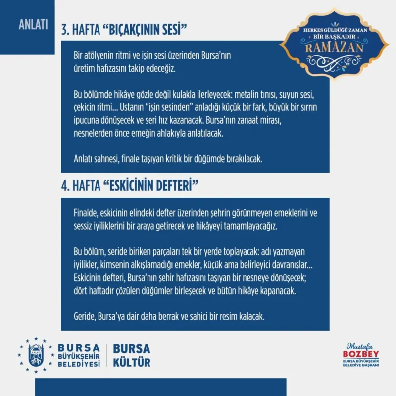 Beyza Akyüz’ün anlatımıyla “Mahya İpi: Bursa’nın Işık Düğümleri”, dört hafta boyunca Bursa’nın gündelik hayatına sinmiş emekleri, incelikleri ve görünmeyen bağları hikâye üzerinden takip ediyor.