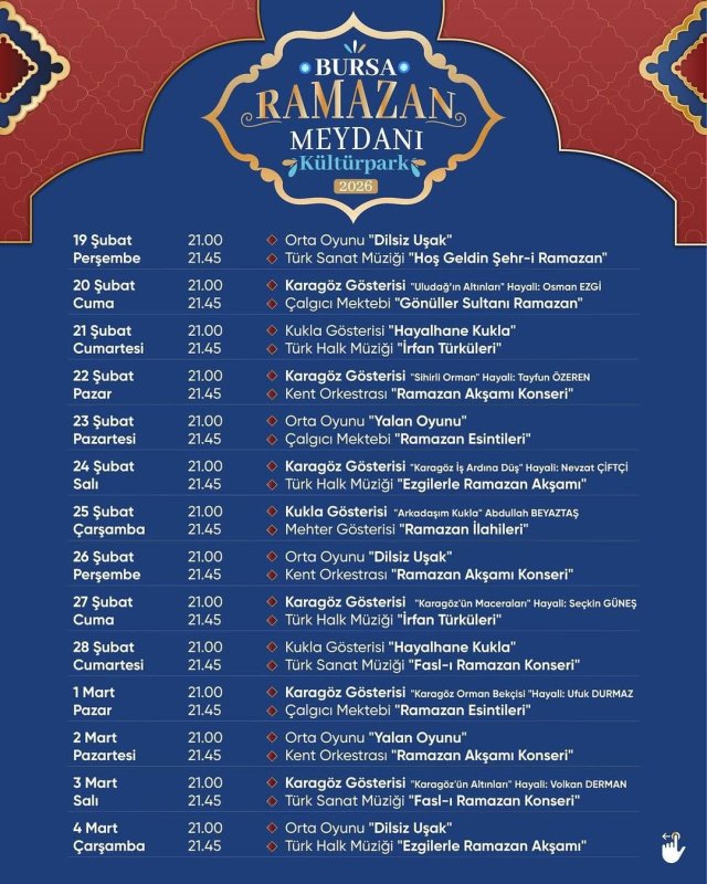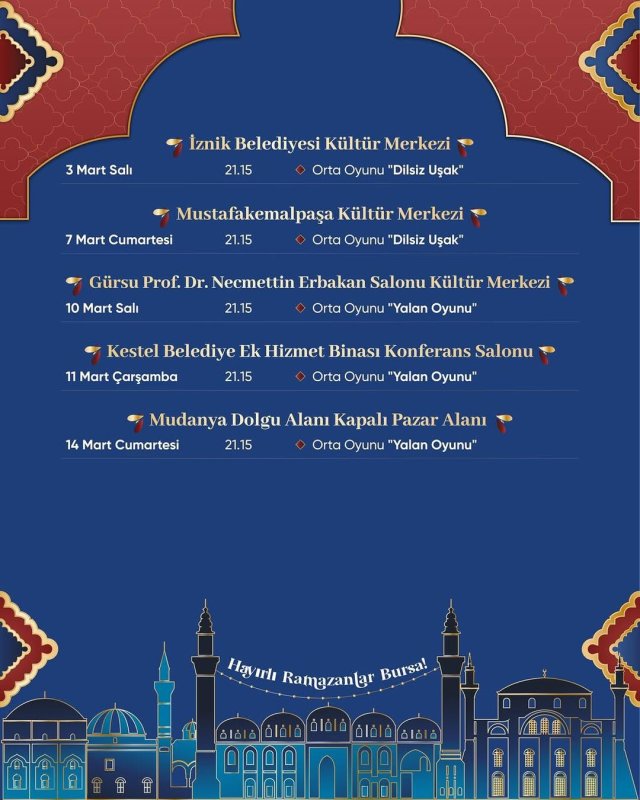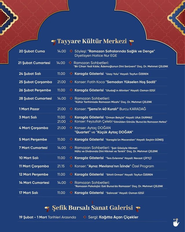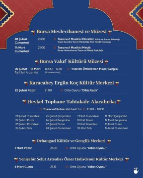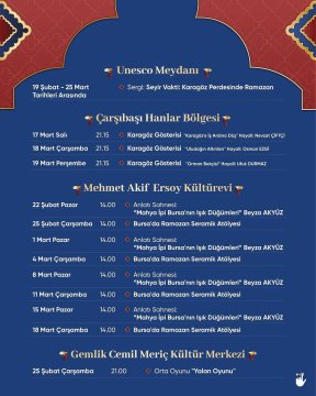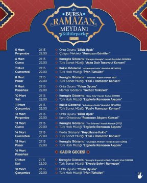 Bursa Büyükşehir Belediyesi olarak, Ramazan ayının birleştirici atmosferini, dopdolu bir etkinlik programı ile pekiştiriyoruz.