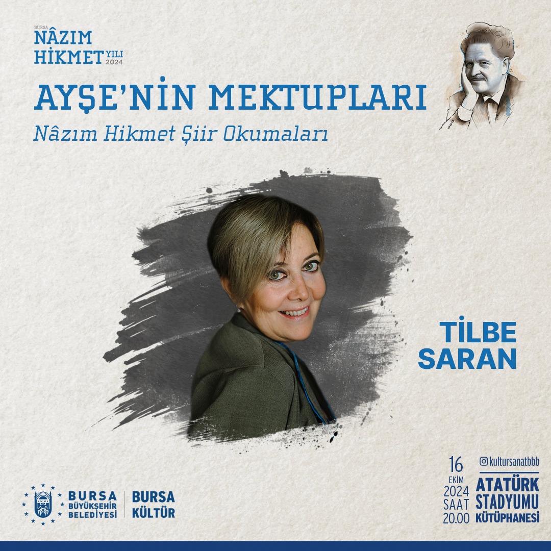 Erden Akbulut ve Turgay Fişekçi'nin de katılımıyla, 6 Ekim Çarşamba günü saat 19.00'da Atatürk Stadyumu Kütüphanesi'nde olacak anlatının ardından, saat 20.00'de Tilbe Saran'ın zengin sesinden "Ayşe'ye Mektuplar" şiirini dinleyeceğiz.